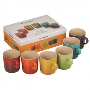 Rainbow collection of 6 x 350ml Le Creuset Mugs in a variety of popular colours including Cerise, Volcanic, Kiwi, Cassis, Dijon Yellow and Caribbean Blue.